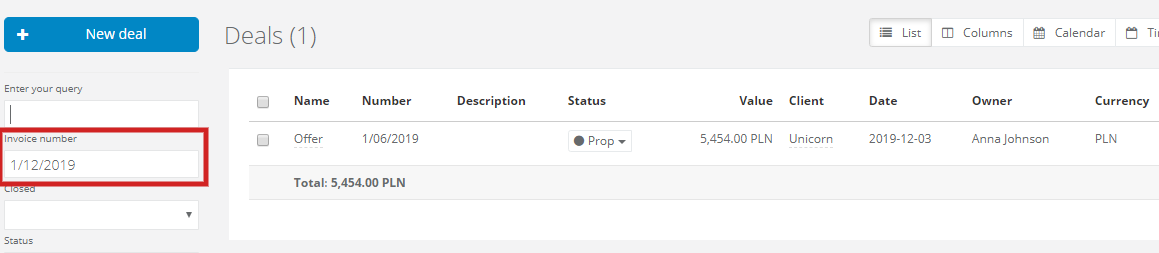 If you want to quickly find a particular invoice and you're using InvoiceOcean.com, then you can use the Invoice number field in the deals browser. Just copy the document's number from the InvoiceOcean.com and paste it in the right field. You can search for deals by a whole number or just its part. While searching by the part, the system will display all records matching search results.
