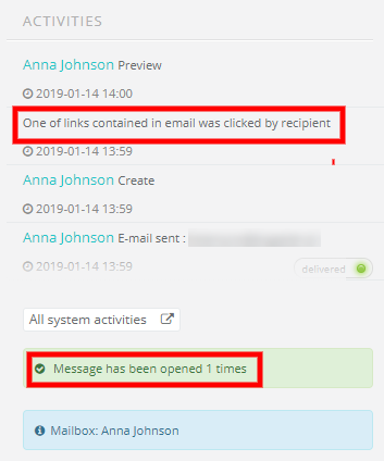 With this feature, in Activities you will see if the receiver opened your email and click in the link. You can find Activities by the right side of an email.