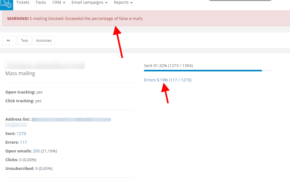 - one-time blockade - if a campaign is sent to 500 or less receivers, it will be blocked after reaching 50 errors (eg. when you have a lot of incorrect addresses). Later it's 10% of errors (eg. when sending a campaign to 700 receivers, it will be blocked with 70 errors). When it comes to this blockade you can contact us and after verifying the campaign we might be able to unblock it. However, it is a warning commiting you to make a thorough check of your contact base and error details (you can find it by clicking on Errors in the campaign card)